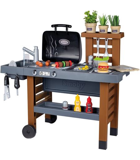 Med det store Smoby udendørs havekøkken kan de lækreste retter tilberedes. Uden at brænde fingrene kan burgere, pølser eller spyd grilles på en legende måde. Burgeren kan toppes af dig selv og spydene sættes sammen, saltes og peberes. Sommerkøkkenet har et topmoderne plancha grillområde og grillrist. Ved hjælp af en drejekontakt hopper selv plastflammer opad gennem grillristen. Sammen med lighteren med mekanisk støj skabes en ægte grillatmosfære. Under de hængslede l-laubs kan de små unge kokke igen og igen tjekke, om maden er tilberedt, som med originalen. Frituregryden er til lækker stegt mad. Alt kan tilberedes perfekt på den store arbejdsflade. I mellemtiden kan det skylles, men der er en vask med ægte vandpumpefunktion (lukket kredsløb). Praktisk: køkkenet vokser med dig! Takket være de aftagelige fodpaneler kan der opnås en højde på 6 cm. En langvarig legesjov, selv for større børn. De mange tilbehør kan placeres på hylderne, så alt kan ryddes op efter spil. Og hvis gæsterne vil sidde et andet sted, er det ikke noget problem. Fordi køkkenet har 2 hjul og et håndtag, som det let kan skubbes til, hvor man skal lave mad. Køkkenet er lavet af UV-resistent plast og er særligt modstandsdygtigt over for fading. ...