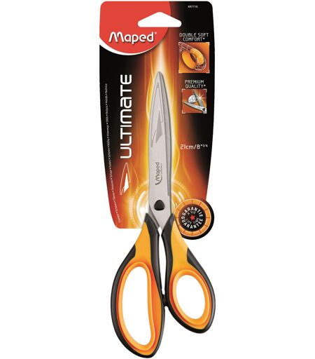 Maped Ultimate sakse Maped Ultimate sakse har en høj kvalitet, hvor bladene er perfekt polerede og præget med et enkelt mønster. Saksen har en minimal modstandskraft, som gør saksen brugervenlig og ideel til præcise klippeopgaver. Saksene har en enestående ergonomi med perfekt fingerstøtte og er fremstillet i et blødt materiale, som gør saksene lækre at holde på og behagelige at bruge - også ved et intensivt brug. Farve: Gul og sort Længde: 21 cm Materiale: Blade af rustfrit stål Livstidsgaranti Minimum 200.000 klip Højrehåndssaks Producentens varenummer: 697710 ...