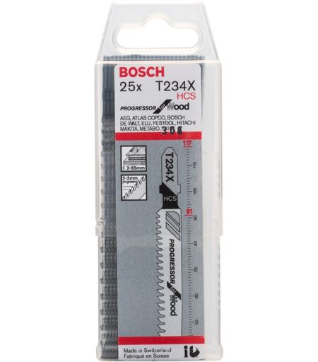 Stiksavsklingen T23 X Progressor for Wood laver rene, lige snit i tykt eller tyndt træ med forskellig tæthed. Tandgeometrien med en medium progressivt stigende tandhøjde og kombinationen af kegleslibekroppen, de præcisionsslebne tænder og den multislebne japanske tandgeometri muliggør en særlig ren skæring. Kulstofstålklingen er velegnet til savning af blødt træ og ikke-slibende træbaserede materialer. T 234 X Progressor for Wood er velegnet til stiksave med T-skaftbeslag. ...