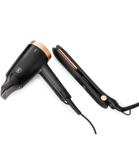 OBH Nordica Glam og Shine Styling Kit er det perfekte sæt, når du skal tørre og style dit hår. Sættet består af en hårtørrer og et glattejern, der begge har et kompakt design og lav vægt, hvilket gør dem nemme at opbevare, uanset om du er hjemme eller skal pakke dem ned i din taske, når du er på farten. Designet er minimalistisk med kobberdetaljer. Hårtørreren er udstyret med en ionisk funktion, hvillket reducerer den statiske elektricitet i håret. Dette bevirker, at dit hår får mere glans og ikke kruser. Hårtørreren har en kraftig 1600 W-motor og har to opvarmningstilstande samt en koldluftsfunktion, der fikserer frisuren og gør, at den holder længere. Den leveres med en koncentrator, der giver dig effektiv og præcis styling. Hårtørreren har også et praktisk ophængningsøje, så du nemt kan opbevare den. Glattejernet har en hurtig opvarmning på ca. 1 minut og har afrundede kanter, så du nemt kan style de fineste krøller. Det har flydende keramiske plader, der er med til at gøre stylingen mere skånsom, fordi trykket på håret reduceres. Med de keramiske plader bliver varmen jævnt fordelt, og dit hår bliver aldrig udsat for overophedning, hvilket medvirker til at få den naturlige glans i håret frem. Glattejernet har en fast monotemperatur på 200°C, og det er udstyret med en låsefunktion, så det forbliver kompakt ved opbevaring. Detaljer: Glattejern og føntørrer Kompakt design Lav vægt Nem at opbevare Kobber-detaljer Føntørrer med 2 varmeindstillinger og koldluftsfunktion Føntørrer med 1600 W-motor Afrundede kanter på glattejernet Glattejern med hurtig opvarmning på 1 min. Ionisk funktion på hårtørreren Keramiske plader på glattejernet ...