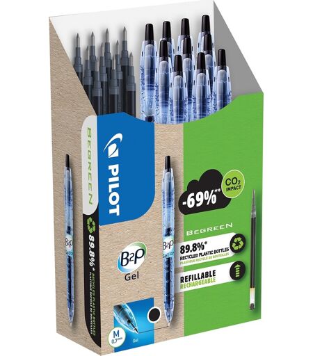 Sampak med Pilot B2P rollerpenne med medium spids og tilhørende refiller Hvert år ender millioner af plastflasker på lossepladser verden over - og det er et unødvendigt spild af ressourcer, som belaster vores planet. Pilot Bottle-2-Pen (B2P) er verdens første serie af kuglepenne med hylstre, som er fremstillet af genanvendte vandflasker. B2P gelpennen er fremstillet af 89,8% genanvendte vandflasker. Designet er unikt og inspireret af denne type plastik - det ses tydeligt på, at pennens hylster er gennemsigtig blå plast med karakteristiske striber magen til dem, som man ofte finder på vandflasker. B2P gelpennen skriver med strålende gelbaseret blæk, som giver en behagelig og glidende skrivefornemmelse. Pennen har trykknap, og den kan nemt genopfyldes med det medfølgende refiller. Sampak med 10 rollerpenne og 10 refiller Skriftfarve: Sort Stregbredde: 0,39 mm Kuglebredde: 0,7 mm Pennene er produceret af 89,8 % genanvendt plast hvoraf 2,5 % er indsamlet fra strand- og havmiljøer Producentens varenr.: BL-B2P-7-B Pilot Begreen serien lever op til Eco Mark-certificeringskrav Pilot Begreen serien er en serie af genopfyldelige skriveredskaber lavet af mindst 70% genanvendt plast. Alle varer i Pilots Begreen serie lever desuden op til strenge krav udformet af den officielle japanske certificering Eco Mark. Certificeringen fremmer produkter der har en mindre miljøpåvirkning i hele produktets livscyklus end andre lignende produkter på markedet. ...