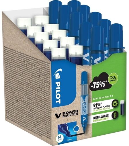 Sampak med V-Board Master whiteboardmarkere med rund spids og tilhørende refiller Slut med whiteboardmarkere som skriver dårligere og dårligere i takt med at de bliver brugt! Pilot V-Board Master whiteboardmarkere skriver til allersidste dråbe. Det patenterede Pilot V-system tilfører automatisk blæk til whiteboardmarkerne – helt uden at du behøver at ryste dem. Det virker endda når markerne bliver holdt skråt opad. Du får et jævnt blækflow og en helt tydelig streg, hver gang. Det super gode blækflow og dybe farveintensitet gør det til en fornøjelse at skrive med Pilot V-Board whiteboardmarkere. Desuden bliver det let som en leg, at opnå et professionelt resultat som er let at læse - også på de bagerste rækker. Når det er tid til at rense whiteboardtavlen, kan Pilot V-Board Master fjernes nemt og uden at efterlade mærker på tavlen. Ofte er helt almindeligt postevand nok til at fjerne blækket. V-Board Master whiteboardmarkerne er en del af Pilots Begreen-serie og de er fremstillet af 91% genanvendt plast. Desuden kan whiteboardmarkerne genopfyldes nemt - det mindsker forbruget og er godt for din pengepung. Sampak med 10 whiteboardmarkere og 10 refiller Farve: Blå Rund spids Faktisk stregbredde: 2,3 mm Spidsbredde: 6 mm Meget dyb farveintensitet Fjernes utrolig let Efterlader ikke mærker på tavlen Kan genopfyldes Produceret af 91 % genanvendt plast Producentens varenr.: WBMA-VBM-M-L-BG Pilot Begreen serien lever op til Eco Mark-certificeringskrav Pilot Begreen serien er en serie af genopfyldelige skriveredskaber lavet af mindst 70% genanvendt plast. Alle varer i Pilots Begreen serie lever desuden op til strenge krav udformet af den officielle japanske certificering Eco Mark. Certificeringen fremmer produkter der har en mindre miljøpåvirkning i hele produktets livscyklus end andre lignende produkter på markedet. ...