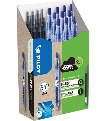 Sampak med Pilot B2P rollerpenne med medium spids og tilhørende refiller Hvert år ender millioner af plastflasker på lossepladser verden over - og det er et unødvendigt spild af ressourcer, som belaster vores planet. Pilot Bottle-2-Pen (B2P) er verdens første serie af kuglepenne med hylstre, som er fremstillet af genanvendte vandflasker. B2P gelpennen er fremstillet af 89,8% genanvendte vandflasker. Designet er unikt og inspireret af denne type plastik - det ses tydeligt på, at pennens hylster er gennemsigtig blå plast med karakteristiske striber magen til dem, som man ofte finder på vandflasker. B2P gelpennen skriver med strålende gelbaseret blæk, som giver en behagelig og glidende skrivefornemmelse. Pennen har trykknap, og den kan nemt genopfyldes med det medfølgende refiller. Sampak med 10 rollerpenne og 10 refiller Skriftfarve: Blå Stregbredde: 0,39 mm Kuglebredde: 0,7 mm Pennene er produceret af 89,8 % genanvendt plast hvoraf 2,5 % er indsamlet fra strand- og havmiljøer Producentens varenr.: BL-B2P-7-L Pilot Begreen serien lever op til Eco Mark-certificeringskrav Pilot Begreen serien er en serie af genopfyldelige skriveredskaber lavet af mindst 70% genanvendt plast. Alle varer i Pilots Begreen serie lever desuden op til strenge krav udformet af den officielle japanske certificering Eco Mark. Certificeringen fremmer produkter der har en mindre miljøpåvirkning i hele produktets livscyklus end andre lignende produkter på markedet. ...