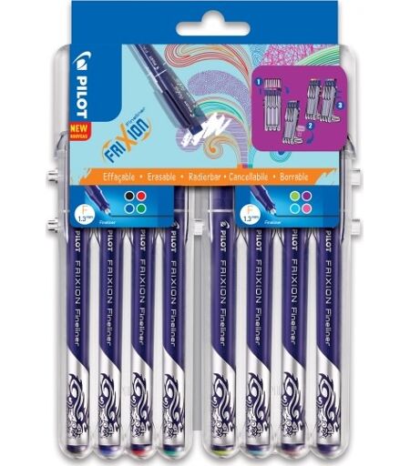 Pilot FriXion Fineliner – glider let henover papiret Skriv, slet og skriv igen så mange gange som du vil - det er det smarte ved Pilot Frixion serien. De sletbare kuglepenne bruger det varmefølsomme Metamo-blæk, som forsvinder ved den friktion som opstår, når du gnider den integrerede viskelæder-spids på blækket. Det fungerer altså nøjagtig ligesom når du bruger et almindeligt viskelæder. Blækket forsvinder bare helt uden snulder - og uden at skade papiret. FriXion Fineliner fra Pilot er gode og kreative fiberpenne med en meget tynd spids, som giver dig en skøn og kreativ skrive- og tegneoplevelse. Pennene gilder let henover papiret når de bruges, hvilket gør dem til en fornøjelse at bruge. Du kan f.eks. bruge pennene til at tage noter, tegne eller farvelægge. FriXion Fineliner har en spids på 1,3 mm og en stregbredde på 0,45 mm og indeholder den unikke FriXion blækteknologi, hvor du hurtigt og nemt kan viske blækket ud med det specielle viskelæder i toppen af pennen, og kan starte forfra hvis du får lavet en fejl eller får skrevet forkert. Sættet er samlet i en praktisk boks fremstillet i 100% genanvendt plast. Låget på boksen kan nemt klikkes på forneden, så du kan have sættet stående oprejst. Dertil kan låget slides op og ned langs siden så du kan justere højden og vinklen på den smarte standup boks. Dertil kan sættes nemt klikkes sammen med andre sæt fra Pilot, ved hjælp af de små klikmekanismer på siden af boksen. Farve: 8 farver Stegbredde: 0,45 mm Blækket kan viskes ud Producentens varenr.: SW-FF ...