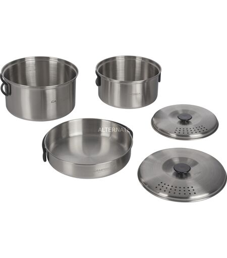 Det campingservice af høj kvalitet, 2197184 fra Campingaz, er let, meget kompakt og robust. Gryderne og lågene er lavet af rustfrit stål (AISI 304) og udstyret med silikonehåndtag. Sættet er let at rengøre og ruster ikke. Den indeholder to gryder, to sillåg og en gryde. ...