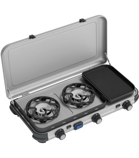 Camping Kitchen 2 Multi Cook campingkomfur er en alt-i-en model med to campingovne og campinggrill i én enhed. Det kombinerer madlavningsglæde med grillsjov takket være tre uafhængigt justerbare brændere med piezo-tænding. Evnen til at lave mad, stege og stege på samme tid giver dig mulighed for at forberede dit næste campingmåltid ikke kun hurtigt, men også varmt. Den rørformede brænder fordeler varmen optimalt under grillpladen i støbt aluminium. Selv på lidt blæsende dage kan du stole på Multi Cook takket være FLAMEGUARD-teknologien, som lover optimal vindbeskyttelse udendørs selv ved vindhastigheder på op til 3 m/s. Efter madlavning og grillning kan gryden støtter, og non-stick grillpladen kan fjernes for nem rengøring. Multi Cook kan derefter gemmes væk sammen med grydestøtterne og grillpladen, beskyttet af låget, indtil næste måltid for at spare plads. ...