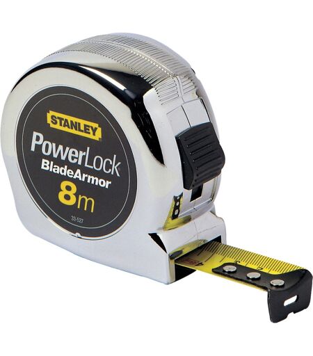 Den 8 meter lange Micro Powerlock Blade Armor fra STANLEY (nøjagtighedsklasse II) er en meget kompakt båndstørrelse i professionel kvalitet, men 13% mindre end Powerlock Standard. Det ekstra tykke 25 mm brede bånd er buet og helt dækket med Mylar beskyttende lag. På de første 8 cm er den desuden dækket af Blade Armor-film, hvilket reducerer risikoen for brud med 90%. Endekrogen er tredobbelt nittet, bevægelig til intern og ekstern måling. Det robuste hus er slagfast, forkromet og poleret. Micro Powerlock Blade Armor målebånd har også en lås, bælteclips og kontrolleret automatisk remretur for optimal beskyttelse af endekrogen. ...
