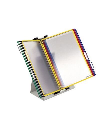 Komplet sæt incl. 10 lommer i flotte assorterede farver Stabilt bladrepanel i solidt, gråt pulverlakeret stål med 10 stk. lommer i A4 format. Skrivebordsmodulet har et smart registersystem. Topåbne Farver: Blå, gul, grøn, rød og sort 5 index faner i 50mm kunststof Leveres komplet lige til at samle ...