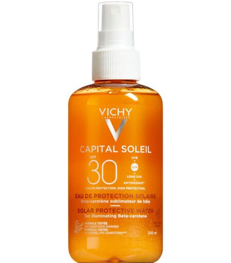 Vichy Ideal Soleil Sublime Tan Protective Water Spray SPF30 til ansigt/krop. SPF30 er en innovativ og frisk solspray, som kombinerer bredspektret UV-beskyttelse med Vichy Thermalsk Kildevand. Beriget med betakaroten, som er med til at give en flot solbrun kulør. Produktet har en frisk konsistens, som føles behagelig og opfriskende på huden. ...