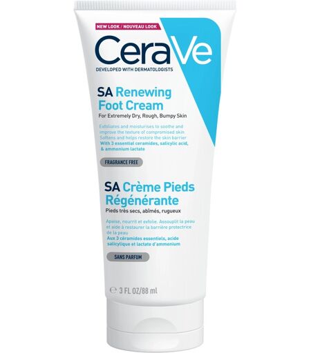 CeraVe SA Renewing Foot Cream er en plejende creme til tør, ru og ujævn hud på fødderne. Den er udviklet sammen med dermatologer og fugter huden effektivt, samtidig med at den bidrager til at styrke den beskyttende hudbarriere på fødderne. Den er beriget med tre essentielle ceramider, salicylsyre, ammoniumlaktat og hyaluronsyre, som eksfolierer og fugter ekstra tørre og ru fødder for at berolige huden. Salicylsyre og ammoniumlaktat opløser døde hudceller og blødgør huden, hyaluronsyre hjælper huden med at bevare sit naturlige fugtniveau, mens ceramiderne hjælper med at styrke hudens barriere langvarigt. Uden parfume. Anvendelse: Påføres i rigelige mængder efter behov. ...