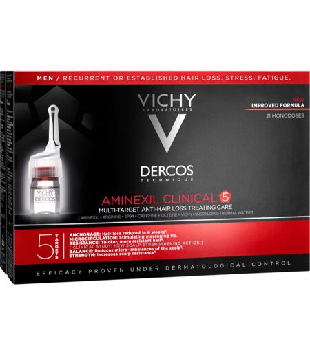 Vichy Dercos Aminexil Clinical 5, 21 x 6 ml, Hårserum til mænd, Produkt Vichy Dercos Aminexil Clinical 5 hjælper dig pålideligt med dine hårproblemer. Egenskaber: virker præventivt mod hårtab Brugsvejledning: Tilfør frotteret hår. Skyl ikke. ...