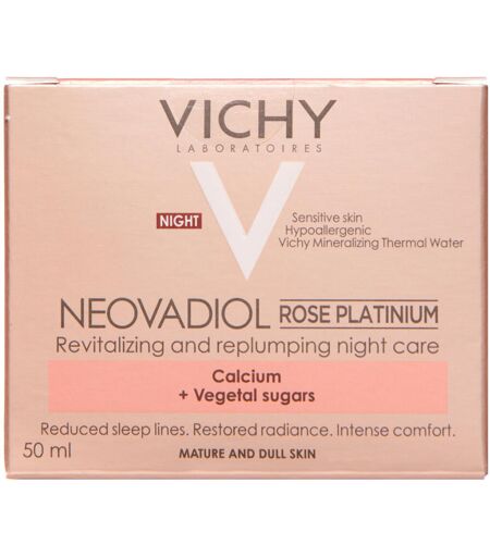 Vichy Neovadiol Rose Platinium Night er en styrkende og revitaliserende natcreme til moden hud, som har mistet sin glød og mangler spændstighed. Velegnet til moden hud med en trist hudtone. Efter 60-års alderen bliver huden tyndere og mere slap. Den mister sin naturlige udstråling. Reducerer effektivt sovelinjer og giver glød, komfort og fugt til huden. Behagelig cremet konsistens med en delikat rosenduft. Testet under dermatologisk kontrol. ...