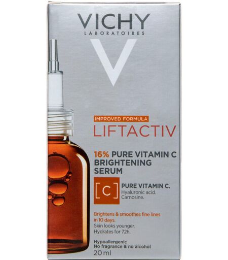 Vichy Liftactiv Supreme Vitamin C Serum giver mindre fine linjer og en mere udhvilet og strålende hud. Højkoncentreret antioxidant anti-age-serum, som styrker hudens antioxidantforsvar samt giver huden en strålende glød og glattere hud efter 10 dage. Reducerer synlige linjer ved daglig brug. Kombineret med Vichy vulkansk vand og kraftige antioxidanter som Pycnogenol og 15 % C-vitamin. Hypoallergen. Testet under dermatologisk kontrol. Dosis og Anvendelse Påfør dagligt på renset og tør hud. Tryk let på applikatoren for at få en nøjagtig ...