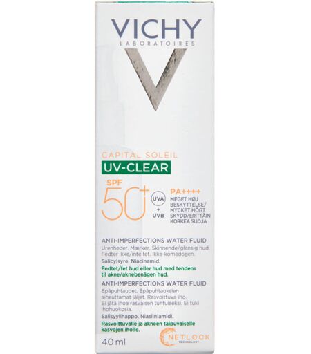 Vichy Capital Soleil UV-Clear Matterende Solcreme til ansigt SPF50+ er en ultralet daglig solcreme til personer med fedtet hud og hud med tendens til akne. Beskytter huden mod UVA- og UVB-stråler. Reducerer og forebygger mærker, urenheder og skinnende hud. Fedter ikke. Tilpasset sensitiv hud. Dosis og Anvendelse Påfør hver morgen som sidste trin i din hudplejerutine i ansigtet og på halsen. Rystes godt inden brug. Påfør solbeskyttelsesproduktet, før du går ud i solen. Påfør hyppigt, så du hele tiden er beskyttet, særligt når du har svedt, været i vandet eller tørret dig. Anvender du for lidt solbeskyttelse, forringes beskyttelsen væsentligt. Undgå kontakt med tøj. SOLRÅD: For meget sol udgør en alvorlig risiko for sundheden. Udsæt ikke små børn for direkte sol. Ophold dig ikke for længe i solen selvom du bruger et solbeskyttelsesprodukt, da det ikke yder 100% beskyttelse. ...