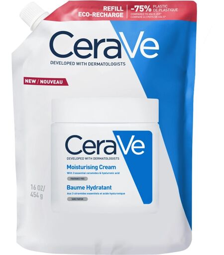 CeraVe Moisturising Cream Refill er en refill af CeraVes fugtgivende creme til tør til meget tør hud både i ansigtet og på kroppen. Den er velegnet til hele familien, også spædbørn fra 2 måneder. Formlen med en unik kombination af 3 essentielle ceramider (1, 3 og 6-II) hjælper med at styrke hudens beskyttende barriere og reducerer således tabet af fugt i huden. Hyaluronsyre hjælper huden med at bevare sit naturlige fugtniveau og MVE-teknologi (MultiVesicular Emulsion Technology) frigiver kontinuerligt fugtgivende ingredienser i over 24 timer og bidrager med at holde huden blød hele dagen. Denne creme er udviklet sammen med dermatologer og testet under pædiatrisk control. Den er hypoallergen, uden parfume og tilstopper ikke porerne. Denne refill kan bruges til genopfyldning af krukken på 454 gr. Der er anvendt 75% mindre plastik til denne refill sammenlignet med 2 x 454 gr. krukker. Fordele: Creme refill Til ansigt og krop Til tør til meget tør hud Fugtgivende i op til 24 timer Styrker hudbarrieren Blødgørende Velegnet til voksne, børn og spædbørn fra 2 måneder Hypoallergen Uden parfume Udviklet sammen med dermatologer Testet under pædiatrisk control Anvendelse: Kan anvendes i ansigtet og på kroppen Påføres i rigelige mængder så ofte som nødvendigt Krukken skal ikke skylles inden genopfyldning fra denne pose Ingrediensliste: AQUA / WATER, GLYCERIN, CETEARYL ALCOHOL, CAPRYLIC/CAPRIC TRIGLYCERIDE, CETYL ALCOHOL, CETEARETH-20, PETROLATUM, POTASSIUM PHOSPHATE, CERAMIDE NP, CERAMIDE AP, CERAMIDE EOP, CARBOMER, DIMETHICONE, BEHENTRIMONIUM METHOSULFATE, SODIUM LAUROYL LACTYLATE, SODIUM HYALURONATE, CHOLESTEROL, PHENOXYETHANOL, DISODIUM EDTA, DIPOTASSIUM PHOSPHATE, TOCOPHEROL, PHYTOSPHINGOSINE, XANTHAN GUM, ETHYLHEXYLGLYCERIN (F.I.L. D213768/2). ...
