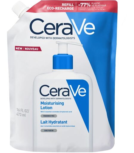 CeraVe Moisturising Lotion Refill er en refill af CeraVes fugtgivende lotion til tør og meget tør hud i ansigtet og på kroppen hos både voksne og børn over 3 år. Den er udviklet sammen med dermatologer og fugter effektivt huden, samtidig med at den bidrager til at styrke den beskyttende hudbarriere. Denne lotion er beriget med tre essentielle ceramider (1, 3 og 6-II) og hyaluronsyre, som fugter huden i løbet af hele dagen efter bare én gangs brug, og giver huden en blødere og glattere følelse. Huden behøver ceramiderne for at styrke sin naturlige beskyttende barriere, mens hyaluronsyre hjælper huden med at bevare sit naturlige fugtniveau. MVE® Technology sikrer kontinuerlig og vedvarende frigørelse af fugt. Den har en let og ikke-fedtende konsistens, som absorberes hurtigt og ikke tilstopper porerne. Formlen er desuden hypoallergen og uden parfume. Denne refill kan bruges til genopfyldning af flasker med pumpe. Der er anvendt 77% mindre plastik til denne refill sammenlignet med 2 x 236 ml flasker. Fordele: Lotion refill Til tør og meget tør hud Til krop og ansigt Effektiv og langvarig fugtgivende Styrker hudbarrieren Velegnet til voksne og børn fra 3 år Let og ikke-fedtende konsistens Absorberes hurtigt Tilstopper ikke porerne Hypoallergen Parfumefri Anvendelse: Påføres i rigelige mængder, så ofte som nødvendigt Kan bruges til både kroppen og ansigtet Flasken med pumpe skal ikke skylles inden genopfyldning fra denne pose Ingrediensliste: Aqua / Water, Glycerin, Caprylic/Capric Triglyceride, Cetearyl Alcohol, Cetyl Alcohol, Dimethicone, Phenoxyethanol, Polysorbate 20, Ceteareth-20, Behentrimonium Methosulfate, Polyglyceryl-3 Diisostearate, Sodium Lauroyl Lactylate, Ethylhexylglycerin, Potassium Phosphate, Disodium Edta, Dipotassium Phosphate, Ceramide Np, Ceramide Ap, Phytosphingosine, Cholesterol, Xanthan Gum, Carbomer, Sodium Hyaluronate, Tocopherol, Ceramide Eop (F.I.L. D213778/1). ...