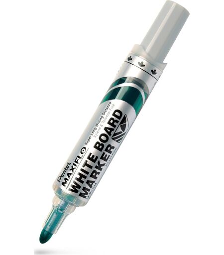 Pentel Maxiflo - det perfekte valg til travle mødelokaler! Pentel Maxiflo whiteboard pen skriver til den sidste dråbe blæk. Det skyldes det unikke og patenterede trykpumpesystem, som skubber blækket ud til spidsen af markeren i en jævn strøm. Det smarte system betyder samtidig, at whiteboard pennen ikke bliver tør. Hvis den gør, ryster du blot pennen og trykker ned - så er du klar til at skrive igen. Maxiflo pennen indeholder mere end dobbelt så meget blæk som de fleste andre standardmarkere, hvilket gør, at den har en 3x længere skrivelængde. Det innovative pumpesystem giver en jævn blækstrøm imens du skriver, også selvom det er midt i et travlt møde hvor der skal skrives nærmest uafbrudt med markeren. Den skriver til sidste dråbe, uden at kvaliteten bliver dårligere. Maxiflo whiteboard pen kan tåle at ligge uden hætte i op til 8 timer. Den er oplagt til whiteboards og elektroniske tavler, fordi den skriver med et intenst og farveægte blæk, som virkelig kan ses. Samtidig er Pentel Maxiflo blid ved tavlen.Maxiflo er en del af Recycology-serien fra Pentel, som hviler på det internationale koncept “reduce, reuse and recycle”. Recycology fokuserer på at anvende ressourceeffektive og genanvendelige materialer. Recycology penne har samme høje kvalitet og samme holdbarhed og pålidelighed som de traditionelle Pentel penne. Maxiflo er fremstillet af 50% genanvendt plastik. Farve: Grøn Spids: Rund Stregbredde: 6 mm Levende farve som giver synlige linjer Fri for sundhedsskadelige stoffer Fjernes med tør klud eller whiteboard tavleviskerFremstillet i 50% genanvendt plast ...