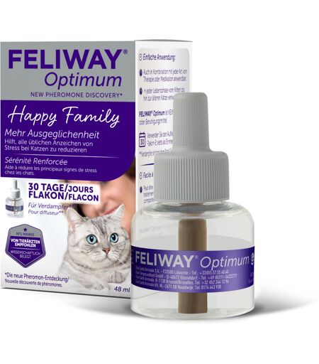 Katte har evnen til at producere feromoner, der fungerer som usynlige sendebud om at slappe af. Ikke desto mindre er der altid situationer, der forårsager reel stress for din hustiger, for eksempel flytning eller andre ændringer i omgivelserne. Feliway® Optimum er udviklet af en forskergruppe og indeholder en avanceret kombination af katte-feromon-ingredienser. Den udsender forskellige duftsignaturer om velvære, der hjælper med at reducere stress og angst hos katte og hjælper dem med at opnå større trivsel, sikkerhed og indre balance.Fordamperen bliver blot sat i stikkontakten og frigiver en innovativ sammensætning af feromoner i luften i rummet, hvilket kan bidrage til mere harmoni kattene imellem og til en forbedret følelse af sikkerhed. Duften er kun mærkbar for katte, andre dyr i husstanden påvirkes ikke af det. For mennesker er Feliway® Optimum lugtfri og derfor ikke irriterende. Da virkningen er videnskabeligt bevist, anbefales Feliway® Optimum af dyrlæger og betragtes som en produktløsning til at modvirke stressrelaterede tegn, såsom urinmarkering, skjul, overdreven kradsning og rengøring. Det kan også hjælpe med at reducere spændinger og konflikter blandt katte og gøre det lettere for en ny kat at vænne sig til. Feliway® Optimum kan også bruges hos dyrlægen, for at gøre opholdet mere behageligt for katteFeliway® Optimum i overblik:Fordamper til stressreduction hos katte i alle livsfaserVelegnet til permanent brugMod stress: kan understøtte ved angst og stressende situationer, forandringer (flytning, nye møbler osv.), spændinger og konflikter med med-katte, tilvænning af en ny katNy, innovativ sammensætningMere trivsel: kan øge følelsen af sikkerhed og fremme harmoni mellem katteModvirker stressrelaterede symptomer: for eksempel nedsat aktivitet, nedsat appetit, overdreven renlighed og kradsning eller vandladning; kan hjælpe katten med at finde balance og ro igenLugtfri for menneskerKun virksom for katte: ingen virkninger på andre dyr i husstandenVidenskabelig dokumenteret effekt: anbefalet af dyrlægerHelt harmløs: ingen beroligende virkning, ingen bivirkningerMeget drøjLet at bruge takket være fordamperen til stikkontaktenIndhold: 48 ml (til op til 70 m² boligareal)Bruges i ca. 30 dageBemærk venligst:Ved vedvarende ændringer i adfærden og stressymptomer hos din kat, bør du altid konsultere din kats dyrlæge, for at udelukke andre behandlingskrævende sygdomme.Læs indlægssedler for produkterne før anvendelse.Bevares utilgængeligt for børn og dyr.Undgå kontakt med øjne og slimhinder. Ved uheld - skyl straks det berørte sted med rigeligt vand og kontakt egen læge.Ved uheld med oral indtagelse- kontakt straks en læge/skadestue og medbring indlægssedler til fremvisning. ...