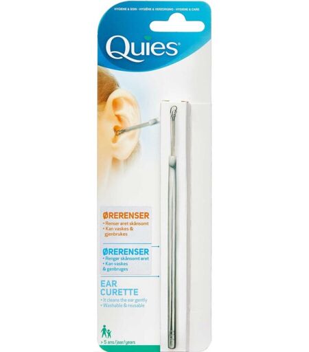 Quies Ørerenser rengør skånsomt øret. Kan vaskes og genbruges. Materiale: Rustfrit stål. Dosis og Anvendelse Før forsigtigt ørerenseren ind i øregangens indgang. Pas på ikke at føre den for langt ind. Fjern forsigtigt ørevoksen ved at udføre udadgående cirkelbevægelser. Opbevaring Opbevares udenfor børns synsfelt og rækkevidde. Vær opmærksom på Hvis du har haft øreproblemer, så tal med din læge. ...
