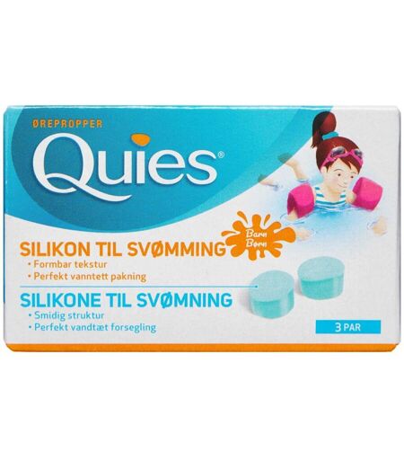 Quies ørepropper til børn i silikone beskytter øret mod vand (svømmehal, hav, brusebad). Deres formbare og let fastklæbende tekstur gør dem fuldstændig vandtætte. Quies ørepropper i silikone beskytter ligeledes mod kulde og støv. Dosis og Anvendelse Form proppen så den bliver flad. Anbring proppen så den dækker indgangen til øret. Tryk på kanterne til proppen slutter helt tæt til øret. Vær opmærksom på Klip ikke proppen over og før den ikke ind i øregangen. ...