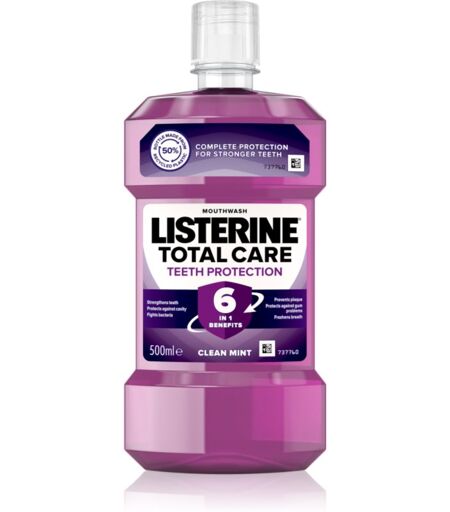 Listerine Essential Care Teeth Protection, 500 ml, Mundskyl og mund sprays unisex, Mundskyl Listerine Total Care Clean Mint frisker ikke kun din ånde op, men bekæmper samtidigt plak og hjælper med at holde tandkød og tænder sunde. Egenskaber: kæmper mod dannelse af karies beskyttelse mod belægning på tænderne dræber bakterier styrker tandemalje holder tandkødet raskt sikrer frisk ånde Brugsvejledning: Skyl munden efter tandbørstning i det tidsrum, der er angivet på pakken, og spyt derefter ud. ...