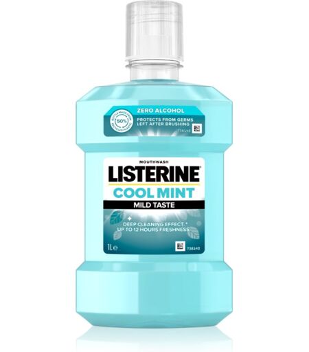 Listerine Cool Mint Mild Taste, 1000 ml, Mundskyl og mund sprays unisex, Mundskyl Listerine Cool Mint Mild Taste frisker ikke kun din ånde op, men bekæmper samtidigt plak og hjælper med at holde tandkød og tænder sunde. Egenskaber: kæmper mod dannelse af karies dræber bakterier beskyttelse mod belægning på tænderne sikrer frisk ånde Brugsvejledning: Skyl munden efter tandbørstning i det tidsrum, der er angivet på pakken, og spyt derefter ud. ...