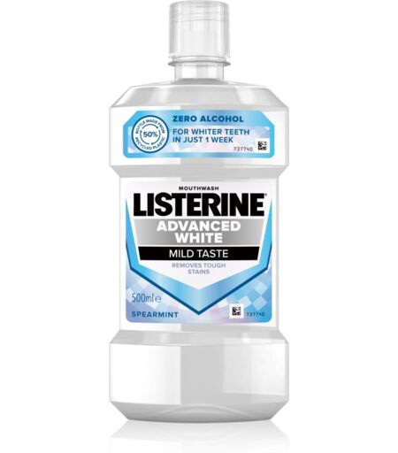 Listerine Advanced White Mild Taste, 500 ml, Mundskyl og mund sprays unisex, Mundskyl Listerine Advanced White frisker ikke kun din ånde op, men bekæmper samtidigt plak og hjælper med at holde tandkød og tænder sunde. Egenskaber: sikrer frisk ånde kæmper mod dannelse af karies dræber bakterier Brugsvejledning: Skyl munden efter tandbørstning i det tidsrum, der er angivet på pakken, og spyt derefter ud. ...