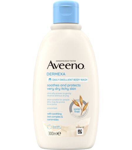 Aveeno Dermexa Daily Emollient Body Wash renser blidt uden at udtørre og får huden til at føles fugtet og rolig. AVEENO Dermexa Daily Emollient Wash i kombination med AVEENO Dermexa Daily Emollient Cream hjælper med at forbedre balancen i hudens naturlige mikrobiom for en mere modstandsdygtig hud, der ser sund ud fra dag 1. Klinisk bevist at rense uden at udtørre huden. Velegnet til meget tør, kløende hud. ...