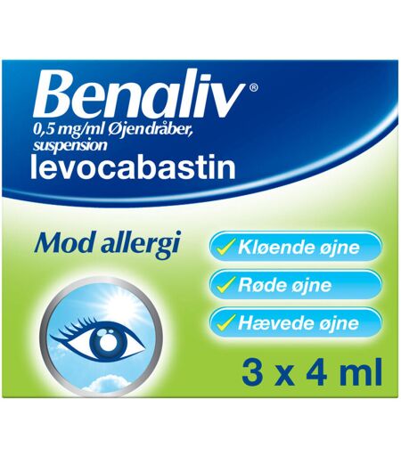 Benaliv anvendes til behandling af allergisk øjenbetændelse, der kommer på bestemte tidspunkter af året, og som viser sig ved at øjnene løber, klør og er røde og øjenlågene hæver eller når øjnene løber på grund af anden form for overfølsomhed (allergi). Benaliv bør ikke gives til børn under 2 år I pakningerne med medicin findes en patientvejledning, som du altid bør læse grundigt, inden du tager medicinen. Hvis du er i tvivl, om du må bruge medicinen, bør du kontakte egen læge. ...