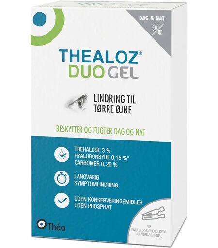 Thealoz Duo Gel lindrer symptomer på tørre, trætte, sviende og irriterede øjne, samt øjne, der løber i vand. Geldråben fordeler sig hurtigt på øjets overflade, men fugter, smører og beskytter længe. Leveres i enkeltdosispipetter, som er lette at anvende. Helt uden konserveringsmiddel for ekstra skånsom pleje af tørre øjne. Bemærkning Opbevares utilgængeligt for børn.Må ikke injiceres eller indtages.Må ikke anvendes i tilfælde af overfølsomhed eller allergi over for et eller flere af indholdsstofferne.Opbevares ved under 25 grader. ...