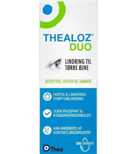 Thealoz Duo Øjendråber giver lindring til tørre øjne. Beskytter, fugter og smører øjets overflade. Hurtig og langvarig symptomlindring. En innovativ og patenteret kombination af trehalose og hyaluronsyyre til behandling af moderat til meget tørre øjne. Uden phosphat eller konserveringsmidler. Kan anvendes af kontaktlinsebrugere. Kan anvendes af børn og voksne samt under graviditet og amning. Bemærkning Opbevares utilgængeligt for børn.Anvendes inden 6 måneder efter anbrud.Til anvendelse i øjet.Læs vejledningen i indlægssedlen inden brug.Må ikke anvendes, hvis du er allergisk over for et eller flere indholdsstofferne.Opbevares ved temperatur mellem 8 og 30 grader. Dosis og Anvendelse 1 dråbe i hvert øje 4-6 gange dagligt eller ved behov. ...