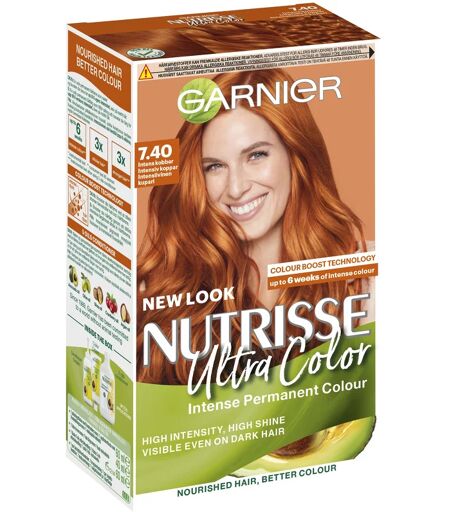 Garnier Nutrisse Ultra Color 4.15 Copper Passion er en permanent hårfarve der er specielt udviklet til, at give masser af næring til håret, samt dække grå hår 100%. Garnier Nutrisse Ultra Color indeholder naturlige frugt olier og aktive ingredienser, som giver intensiv pleje til hårstrået, mens håret bliver farvet. Efterbehandlingscremen indeholder 5 forskellige plejende olier, der gør dit hår strålende blankt samt modvirker tørt hår. Dette sikrer en perfekt dækning, samt et glansfuldt og holdbart resultat. Denne nuance anbefales til sort til mørkebrunt, brunt til lysebrunt og mørkeblond til lysblond hår. OBS: Farveresultatet afhænger af din naturlige hårfarve og farvegrundlaget. Man bør altid læse den pågældende pakkes anvisning nøje inden påbegyndt behandling, samt følge anbefalingerne der står oplyst på denne i forhold til hvilke naturlige hårfarver den anbefales til, trækketid, blandingsforhold osv. Indeholder: 1 stk. Farvecreme 40 ml 1 stk. Fremkaldercreme 60 ml 1 stk. Efterbehandlingscreme 60 ml 1 par Beskyttelseshandsker 1 stk. Brugsvejledning Fordele: Hårfarve til hjemmebrug Permanent creme hårfarve Ultra glansfuld farve Dækker grå hår 100% Indeholder 5 naturlige olier Giver intensiv pleje og næring Anvendelse: Læs og følg altid brugsvejledningen meget nøje Udfør allergitesten 48 timer før brug, der er beskrevet på pakken Ingrediensliste: 1206562 Farvecreme: Aqua / Water, Cetearyl Alcohol, Propylene Glycol, Deceth-3, Laureth-12, Ammonium Hydroxide, Oleth-30, Lauric Acid, Hexadimethrine Chloride, Glycol Distearate, Polyquaternium-22, Ethanolamine, Silica Dimethyl Silylate [Nano] / Silica Dimethyl Silylate, Ci 77891 / Titanium Dioxide, 2,3-Diaminodihydropyrazolo Pyrazolone Dimethosulfonate,5-Amino-6-Chloro-O-Cresol, P-Aminophenol, 4-Amino-2-Hydroxytoluene, Ascorbic Acid, Tocopherol, Sodium Metabisulfite, Helianthus Annuus Seed Oil / Sunflower Seed Oil, Dimethicone, Carbomer, Rosmarinus Officinalis (Rosemary) Extract, Edta, Vitis Vinifera Seed Oil / Grape Seed Oil, Parfum / Fragrance. (F.I.L. C202748/1). 1190019 Fremkaldercreme: Aqua / Water, Hydrogen Peroxide, Cetearyl Alcohol, Trideceth-2 Carboxamide Mea, Ceteareth-25, Glycerin, Tetrasodium Etidronate, Tetrasodium Pyrophosphate, Sodium Salicylate, Phosphoric Acid, Parfum / Fragrance. (F.I.L. C249244/1). 1238538 E - Efterbehandling: Aqua / Water, Cetearyl Alcohol, Dimethicone, Glycerin, Behentrimonium Chloride, Olea Europaea Fruit Oil / Olive Fruit Oil, Argania Spinosa Kernel Oil, Vaccinium Macrocarpon (Cranberry) Seed Oil, Helianthus Annuus Seed Oil / Sunflower Seed Oil, Rosmarinus Officinalis Leaf Extract / Rosemary Leaf Extract, Persea Gratissima Oil / Avocado Oil, Butyrospermum Parkii Butter / Shea Butter, Amodimethicone, Isopropyl Alcohol, Caprylyl Glycol, Citric Acid, Lactic Acid, Tocopherol, Sodium Benzoate, Cetrimonium Chloride, Linalool, Benzyl Alcohol, Parfum / Fragrance. (F.I.L. C201680/1). ...