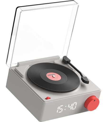 MOBILITY ON BOARD Retro Vinyl højttaler, gråLeder du efter en unik måde at nyde din musik på? Oplev MOB retro kollektion og dens nye højttaler! Med dens Bluetooth-funktion kan du afspille dine yndlingssange. Flyt vinylafspillerens svingarm og lad pladen snurre for at starte musikken og slukke den. Også udstyret med et diskret vækkeur, vil vores højttaler tage sig af dig om morgenen til en blid opvågning indtil slutningen af natten til dine aftener med vennerne. Med en effekt på 5W og en batteritid på 8 timer vil den glæde både forældre og børn. Vores nye højttaler er en subtil blanding mellem fortid og fremtid.5WBatterilevetid 8 timerVækkeur ...