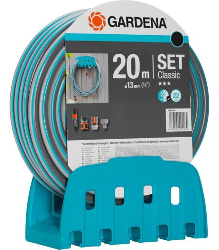 Startsæt med beslag og slange Slangen er trykfast og bibeholder formen. Slangen opbevarer du ganske enkelt ved at rulle den omkring vægbeslaget. Altid klar til brug. Der er praktiske ophængningspladser til mundstykker, sprøjtehoveder og sprinklere. ...