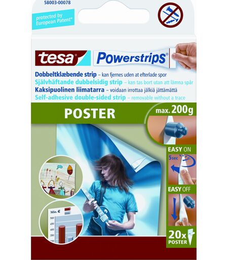 Nem at anvende og kan fjernes igen uden at efterlade klæberester Nu er det slut med at være bekymret for tapetet eller malingen, når ungerne gerne vil hænge tegninger og plakater op på væggen. Med de smarte tesa® Powerstrips Poster undgår du helt at ødelægge både overflade og den genstand, som du gerne vil hænge op. Små dobbeltklæbende strips, som kan fjernes igen helt uden at efterlade klæberester eller beskadige væggen, tapetet eller plakaten. Brug dem hjemme, på kontoret eller i butikken til genstande på op til 200 g. Ved fjernelse hiver man blot forsigtigt i snippen; derved løsner genstanden sig og kan fjernes helt uden spor; selv på sarte overflader som tapet eller lak. Ikke velegnet til styrofoam, skummaterialer, overflader med slip-let belægning og porøse materialer. Large: til genstande på op til 200 g Indeholder 20 stk. Powerstrips tesa nr. 58003 ...