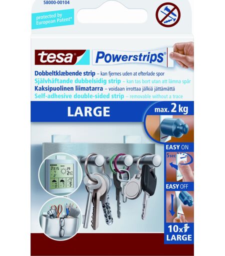 Nem at anvende og kan fjernes igen uden at efterlade klæberester tesa Powerstrips er den smarte alternative løsning til boremaskine, hammer og søm. Powerstrips er dobbeltklæbende strips til ophængning af f.eks. plakater, skemaer eller tegninger i hjemmet, i butikken eller på kontoret. De hæfter på de fleste overflader og kan fastgøre forskellige størrelser helt op til 1,5 kg.Du kan nemt fjerne plakaten og strip’en igen – helt uden at den efterlader klæberester eller beskadiger væggen, tapetet eller plakaten. Large: til genstande på op til 1,5 kg Indeholder 10 stk. Large Powerstrips tesa nr. 58000 ...