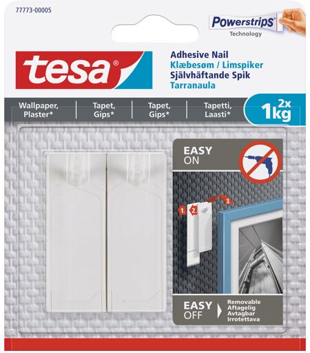 Smart klistersøm til genstande på strukturerede og sarte overflader Lad være med at bruge tid og kræfter på at bore huller i væggen eller at skulle stå og bøvle med søm og hammer. Med klæbesømmet fra tesa® sikrer du let, bekvem og pålidelig montering, der er perfekt til ophængning af pyntegenstande, billeder mm. Et smart alternativ til skruer eller søm, der er særlig velegnet til at blive fastgjort på sarte og strukturerede overflader som tapet og gips. Hver af de selvklæbende søm har en bærekraft på op til 1 kg, hvilket skyldes den effektive klæbestrips, som er med til at sikre at sømmene er godt fastgjort, så du kan være helt sikker på at de genstande, som du hænger op, ikke falder ned. Gøres der tilmed brug af to søm, øges bærevnen til 2 kg, hvilket gør det muligt for dig at hænge både tungere eller større genstande op. Monteringen af klæbesømmene er utrolig let idet det blot tager et øjeblik at fastgøre sømmene uden at der skal gøres brug af forskelligt værktøj eller at der forårsages skade på overfladen. Og takket været tesas® Powerstrips®-teknologien kan sømmene nemlig fjernes nemt og hurtigt uden at der efterlades klæberester på underlaget. Derudover er det også muligt at genbruge klæbesømmene med blot en ny klæbestrip. Vær opmærksom på at overfladen skal være ren og fri for støv. Overfladens øverste lag som f.eks. maling skal tilmed også være i tilstrækkelig stand til at kunne være en belastning. Hvis væggen er nymalet, er det vigtigt, at malingen er gennemhærdet. Produkttype: Klæbesøm Overflade: Tapet og gips Indhold: 2 søm og 3 strips Farve: Hvid Striptybe: Indendørs Bæreevne: Op til 1 kg pr. søm Skadefri ophæng – klæber godt, fjernes uden klæberester tesa nr. 77773 ...