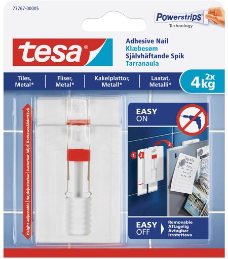 Smart og justerbart klistersøm til tunge genstande på fliser og metal Lad være med at bruge tid og kræfter på at bore huller i væggen eller at skulle stå og bøvle med søm og hammer. Med det justerbare klæbesøm fra tesa® sikrer du let, bekvem og pålidelig montering, der er perfekt til ophængning af tungere pyntegenstande, køkkenredskaber mm. Særlig velegnet til at blive fastgjort på glatte overflader som fliser, glas og metal, er dette et perfekt alternativ til skruer eller søm. Hver af de selvklæbende søm har en bærekraft på op til 4 kg, hvilket skyldes den effektive klæbestrips, som er med til at sikre at sømmene er godt fastgjort, så du kan være helt sikker på at de genstande, som du hænger op, ikke falder ned. Gøres der tilmed brug af to søm, øges bærevnen til hele 8 kg, hvilket gør det muligt for dig at hænge både tungere eller større genstande op. Klæbesømmet er derudover også højdejusterbart, hvilket gør det særligt velegnet til hvis du vil bruge to søm til ophæng af én enkel genstand, eller hvis du har flere ting, der skal hænge pænt på samme linje. Dermed kan du altid tilpasse højden på sømhovedet, så dét du hænger op, bliver placeret lige i dén højde som du ønsker. Monteringen af klæbesømmene er utrolig let idet det blot tager et øjeblik at fastgøre sømmene uden at der skal gøres brug af forskelligt værktøj eller at der forårsages skade på overfladen. Og takket været tesas® Powerstrips®-teknologien kan sømmene nemlig fjernes nemt og hurtigt uden at der efterlades klæberester på underlaget. Derudover er det også muligt at genbruge klæbesømmene med blot en ny klæbestrip. Produkttype: Justerbart klæbesøm Overflade: Fliser og metal Indhold: 2 søm og 6 strips Farve: Hvid Striptybe: Indendørs Bæreevne: Op til 4 kg pr. søm Skadefri ophæng – klæber godt, fjernes uden klæberester tesa nr. 77767 ...