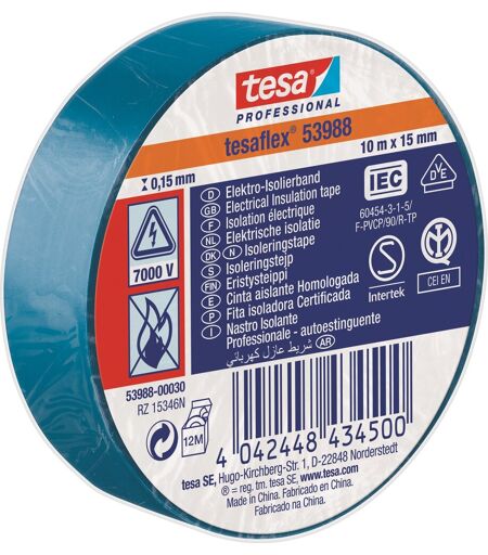 Tesa 53988 tesaflex er en professionel isoleringstape udviklet til elektriske installationer, hvor høj driftssikkerhed er nødvendig. Takket være sin fleksible PVC-bagside og stærke klæbeevne er denne tape ideel til både isolering, bundtning og mærkning af elektriske ledninger og komponenter. Den er nem at påføre, selv ved lavere temperaturer, og tilpasser sig smidigt til ujævne overflader. Tre vigtige fordele ved Tesa 53988 tesaflex Godkendt op til 7000 V: Elektrisk isolering med høj sikkerhed Flammehæmmende og selvslukkende: For ekstra tryghed i el-installationer Fleksibel og let at påføre: Perfekt til kurvede eller ujævne flader Godkendt sikkerhed og certificeringer Tapen er certificeret i henhold til IEC 60454-3-1 og godkendt til anvendelse op til 7000 volt. Den er selvslukkende, hvilket øger sikkerheden i installationer med elektrisk risiko. Med dimensionerne 15 mm x 10 meter er den velegnet til både større og mindre el-opgaver i professionelle miljøer. Specifikationer Type: PVC-isoleringstape Bredde: 15 mm Længde: 10 m Farve: Blå Tykkelse: 0,15 mm Spændingsmodstand: Op til 7000 V Godkendelser: IEC 60454-3-1, Intertek, CEI EN Flammehæmmende: Ja Levetid efter åbning: 12 måneder tesa nr. 53988 ...
