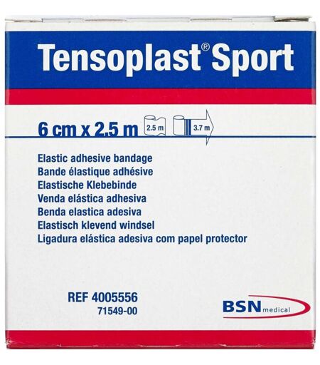 Tensoplast Sport er en elastisk og selvklæbende hvid bandage til støtte. Klæbemassen er pålagt i striber, hvilket gør det lettere at fjerne. Stor klæbeevne holder bandagen sikkert på plads. Høj elasticitett gør bandagen let at anlægge og komfortabel i brug. Stor strækstyrke sikrer god stabilitet. Høj luftgennemtrængelighed tillader huden at ånde. Dækpapir på hele rullen giver mulighed for at afklippe afmålte stykker. Latex-fri. Anvendes til forebyggelse og behandling af sportsskader. Kan fiksere forbindinger og skinner. Anvendes ved forstuvning og forstrækning. Bemærkning Opbevares tørt og beskyttet mod sollys. ...