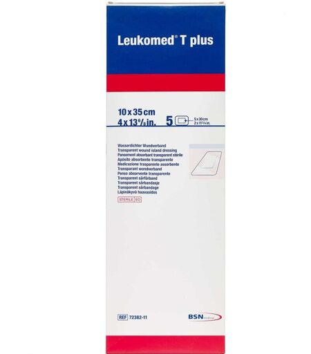 Leukomed T plus 10 x 35 cm 5 stk. Leukomed T plus er en transparent steril sårbandage. Den højabsorberende sårbandage har en åndbar barierre mod vand og bakterier. Leukomed T plus er åndbar og beskytter mod bakterier og vira. Klæber ikke til såret. Har afrundede hjørner, der ikke løsner sig. Anvendes til overfladiske brandsår, hudafskrabninger og tørre eller moderat væskende operationssår. Bemærkning Opbevares tørt og beskyttet mod sollys.Må sidde på i op til 7 dage. Dosis og anvendelse Anvendes efter behov. ...