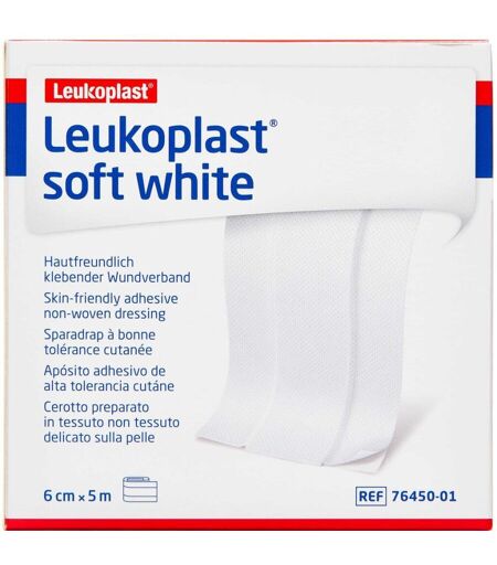 Leukoplast soft white 6cm x 5m Leukoplast soft white er et hudvenligt selvklæbende plaster. Bemærkning Kun til engangsbrug. Dosis og Anvendelse Kan anvendes i forbindelse med skrammer og sår diverse steder på kroppen. Anvendes efter behov. ...