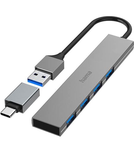 HAMA 3.2 USB-A Hub 4x Porte m/ USB-C AdapterIdeel, når der er brug for flere forbindelser. Til tilslutning af pc, notebook, MacBook eller tablet med ekstern harddisk, USB-stick, mus, tastatur eller printer. Der medfølger USB-A til USB-C adapter med i æsken.Specifikationer:Produkttype: USB-A HubFarve: GråPorte: 4 x USB-A (3.2)Tilslutning: USB-A (medfølgende USB-C adapter)Størrelse (B x D x H): 10,7 x 2,1 x 0,7 cmVægt: 54 g ...