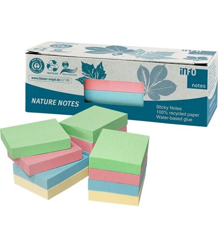 iNFO Nature Notes Mix 50x40 mm, 100 blade - notes lavet af 100% genanvendt papiriNFO Nature notes er produceret hos en af verdens førende producenter af notes, hvor der ikke bare hersker fokus på at producere kvalitetspapir med stærk lim, hvor både produkter og processer er optimeret efter høje standarter.Med iNFO Nature notes får du ikke bare memoblokke produceret i 100% genanvendt papir, men selv emballagen er produceret i genanvendte materialer. Blokkene leveres i flotte kartonner uden plastindpakning.Post-its eller notes er en af verdens mest solgte kontorartikler. De er helt uundværlige på ethvert kontor, til dig som i farten har behov for at tage midlertidige notaer og kunne flytte disse rundt efter behov. iNFO Nature notes kan fås i en række af de gængse formater – og du kan vælge frit mellem den traditionelle gule farve eller en af de mere spændende mixede farver. Format: 50x40 mmFarve: 3 blokke i hver af farverne gul, grøn, rød og blå100 blade pr. blok12 blokke i en pakkeEkstra bred 25 mm limfeltVandbaseret lim uden opløsningsmidlerBlue Angel Ecolabel certificeretProduceret af 100% genanvendt papirEmballagen er produceret i genanvendte materialerProduceret i Tyskland ...