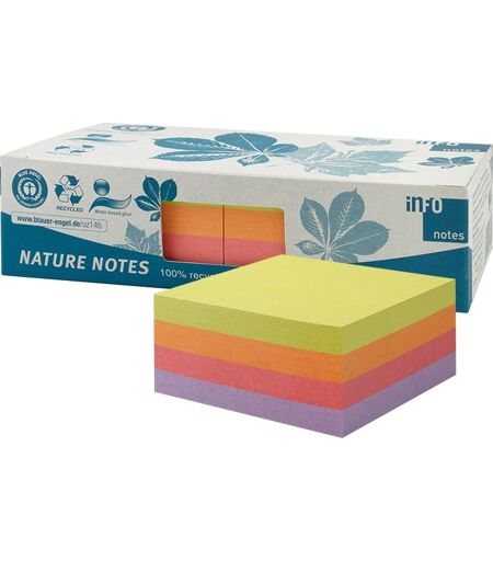 iNFO Nature Notes Mix 75x75 mm, 400 blade - notes lavet af 100% genanvendt papiriNFO Nature notes er produceret hos en af verdens førende producenter af notes, hvor der ikke bare hersker fokus på at producere kvalitetspapir med stærk lim, hvor både produkter og processer er optimeret efter høje standarter. Med iNFO Nature notes får du ikke bare memoblokke produceret i 100% genanvendt papir, men selv emballagen er produceret i genanvendte materialer. Blokkene leveres i flotte kartonner uden plastindpakning.Post-its eller notes er en af verdens mest solgte kontorartikler. De er helt uundværlige på ethvert kontor, til dig som i farten har behov for at tage midlertidige notaer og kunne flytte disse rundt efter behov. iNFO Nature notes kan fås i en række af de gængse formater – og du kan vælge frit mellem den traditionelle gule farve eller en af de mere spændende mixede farver. Format: 75x75 mmFarve: 2 cubes med farverne orange, grøn, koral og lilla100 blade pr. blok2 cubes i en pakkeEkstra bred 25 mm limfeltVandbaseret lim uden opløsningsmidlerBlue Angel Ecolabel certificeretProduceret af 100% genanvendt papirEmballagen er produceret i genanvendte materialerProduceret i Tyskland ...