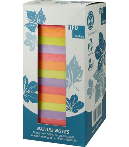 iNFO Nature Notes Mix 75x75 mm, 100 blade - notes lavet af 100% genanvendt papiriNFO Nature notes er produceret hos en af verdens førende producenter af notes, hvor der ikke bare hersker fokus på at producere kvalitetspapir med stærk lim, hvor både produkter og processer er optimeret efter høje standarter.Med iNFO Nature notes får du ikke bare memoblokke produceret i 100% genanvendt papir, men selv emballagen er produceret i genanvendte materialer. Blokkene leveres i flotte kartonner uden plastindpakning.Post-its eller notes er en af verdens mest solgte kontorartikler. De er helt uundværlige på ethvert kontor, til dig som i farten har behov for at tage midlertidige notaer og kunne flytte disse rundt efter behov. iNFO Nature notes kan fås i en række af de gængse formater – og du kan vælge frit mellem den traditionelle gule farve eller en af de mere spændende mixede farver. Format: 50x40 mmFarve: 3 blokke i hver af farverne orange, grøn, koral og lilla100 blade pr. blok16 blokke i et tårnEkstra bred 25 mm limfeltVandbaseret lim uden opløsningsmidlerBlue Angel Ecolabel certificeretProduceret af 100% genanvendt papirEmballagen er produceret i genanvendte materialerProduceret i Tyskland ...