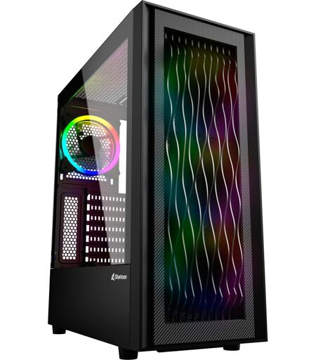 For spillere eller surfere: RGB Wave''s luftgennemtrængelige frontpanel er prydet med et imponerende 3D-bølgemønster, bag hvilket tre RGB-blæsere skinner. Sammen med 120 mm blæseren installeret på bagsiden forbliver alt køligt i Midi-ATX-kabinettet. Derudover har RGB Wave et I/O-panel med to USB 3.2-porte og et USB Type C-3.2 Gen 2-stik samt et sidepanel i hærdet glas. Med RGB Wave tilbyder fronten et specielt blikfang. Plastlameller strækker sig over fronten, hvilket giver det hele et specielt 3D-bølgedesign. Dette fremhæves af belysningen af de tre 120 mm RGB-blæsere, der er forudinstalleret direkte bag den. Prikken over i''et leveres af rammen med kulfibertekstur, der løber rundt om bølgemønsteret. I RGB-bølgen gives alt for at muliggøre køleventilation. Fra og med fronten, hvorigennem luft let kan strømme ind i sagen, installeres fire 120 mm RGB-blæsere ab fabrik. Tre foran, en bagpå. For yderligere at forbedre luftstrømmen er der valgfri plads øverst til to ekstra ventilatorer med en diameter på 120 mm eller 140 mm. En 120 mm blæser kan også installeres øverst på strømforsyningstunnelen, hvis det er nødvendigt. Ud over sin smarte front er RGB Wave også et elegant udstillingsvindue på grund af sidepanelet i hærdet glas. De indbyggede komponenter kommer til deres ret og kan præsenteres optimalt. For at gøre det klare og ryddelige indtryk muligt, kan alle kabler styres ud af syne ved hjælp af kabeludtag. Med sine slanke dimensioner skærer RGB Wave en fin figur og kan let integreres i enhver opsætning. Samtidig rummer den kompakte Midi-ATX-sag også større hardware: grafikkort kan være op til 33,5 cm lange, CPU-kølere op til 15,7 cm høje og strømforsyninger op til 17,5 centimeter lange. Hvis du værdsætter meget lagerplads, kan du montere op til fem SSD''er i sagen. Derudover kan to 3,5-tommer HDD''er rummes i harddiskburet, hvis der ikke er installeret SSD''er der. ...