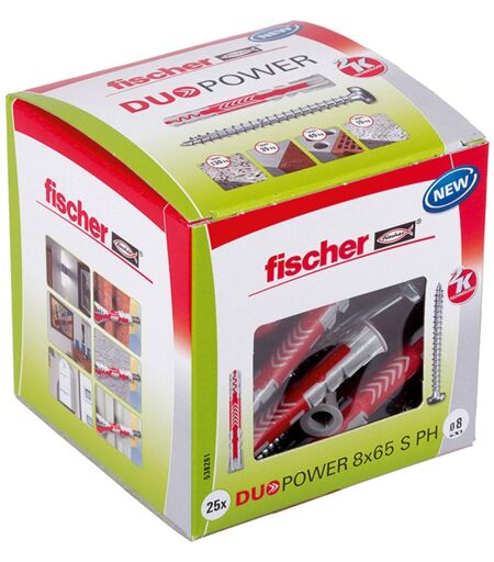 Fischer universal dowel DUOPOWER 538261 tilbyder meget gode holdeværdier på grund af 2 komponenter: Afhængigt af byggematerialet aktiverer den grå komponent lavet af nylon af høj kvalitet automatisk det optimale driftsprincip (spredning, klapper, knuder) for det bedste greb. Ekspansionsvingerne på den røde komponent understøtter sikker spredning og giver ekstra sikkerhed til den grå komponent. De udtalte co-roterende enheder låser i byggematerialet og forhindrer rotation i borehullet. Den glatløbende åbning sikrer nem fastgørelse af skruen og sikker styring og fiksering i skruekanalen. Fischer DUOPOWER forhindrer skruen i at vælte og giver den bedst mulige feedback (feel-good faktor) af dyvelen. Du kan mærke, at dyvelen passer perfekt. Kanten dannet på dyvelhovedet forhindrer også dyvelen i at glide ind i borehullet. ...