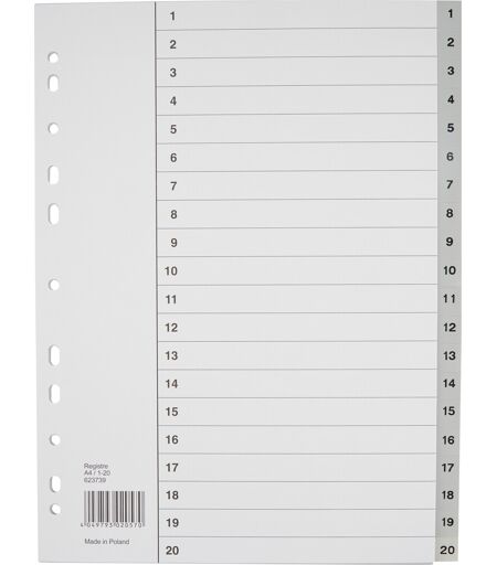 Super anvendeligt budget register i PP plastSuper kvalitet til en god pris! Talregister, som er nummereret fra 1-20. Den er produceret i en smart PP-folie, og er i et smart design, hvor der er plads til rigelig tekst. Det behøver ikke at være dyrt eller besværligt at holde kontrol over dine mappers indhold med dette nummererede register til en fordelagtig pris. Få orden i dine brevordnere og ringbind. Registeret har plads til 20 forskellige emner, og du kan skrive emnerne på indholdssiden/forbladet i karton, som sættes forrest i mappen. Opdeling: 1-20Format: A4 Farve: GråFremstillet i polypropylen med forblad i karton Producentens varenummer: 623739 ...