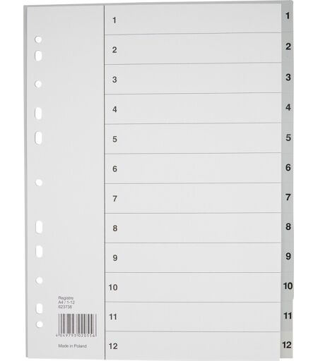 Budget register i A4 format Det behøver ikke at være dyrt eller besværligt at holde kontrol over dine mappers indhold med dette nummererede register til en fordelagtig pris. Få orden i dine brevordnere og ringbind. Registeret har plads til 12 forskellige emner, og du kan skrive emnerne på indholdssiden/forbladet i karton, som sættes forrest i mappen. Farve: Grå Opdeling: 1-12 Format: A4 Fremstillet i miljøvenlig polypropylen Forblad i karton Producentens varenummer: 623738 ...